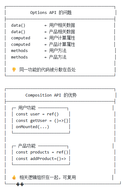 Composition API 的优点是能够将相关逻辑的代码组织在一个地方,复用重复的逻辑。