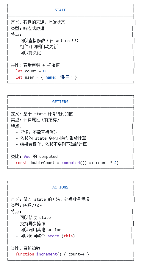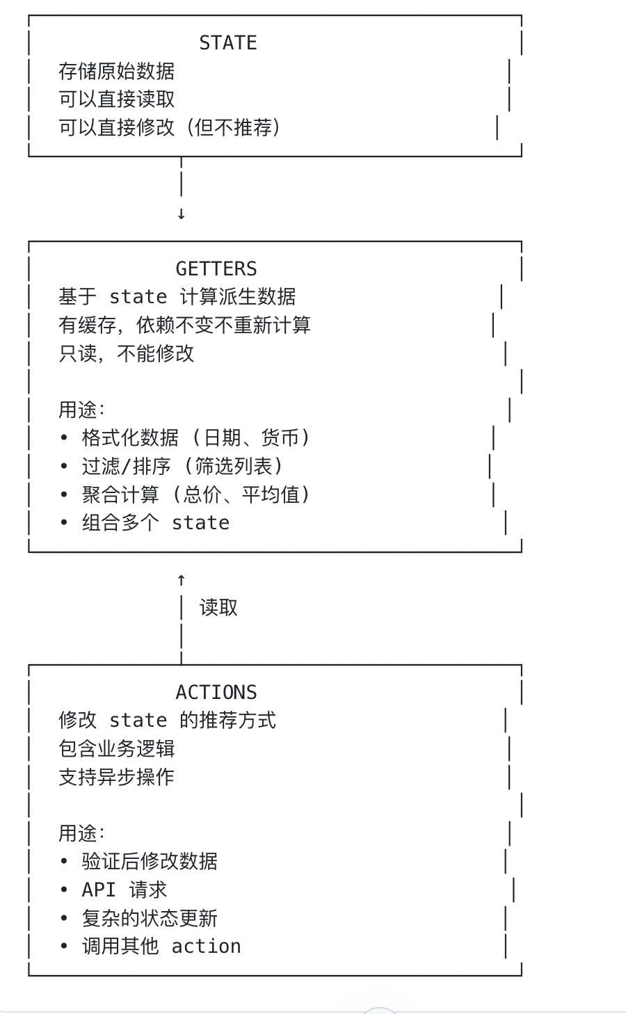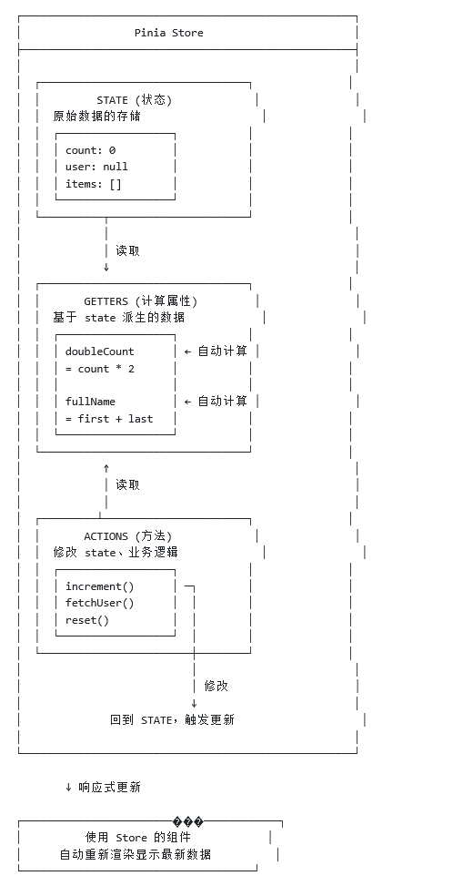 pinia = 数据存储 + 业务逻辑 + 状态管理