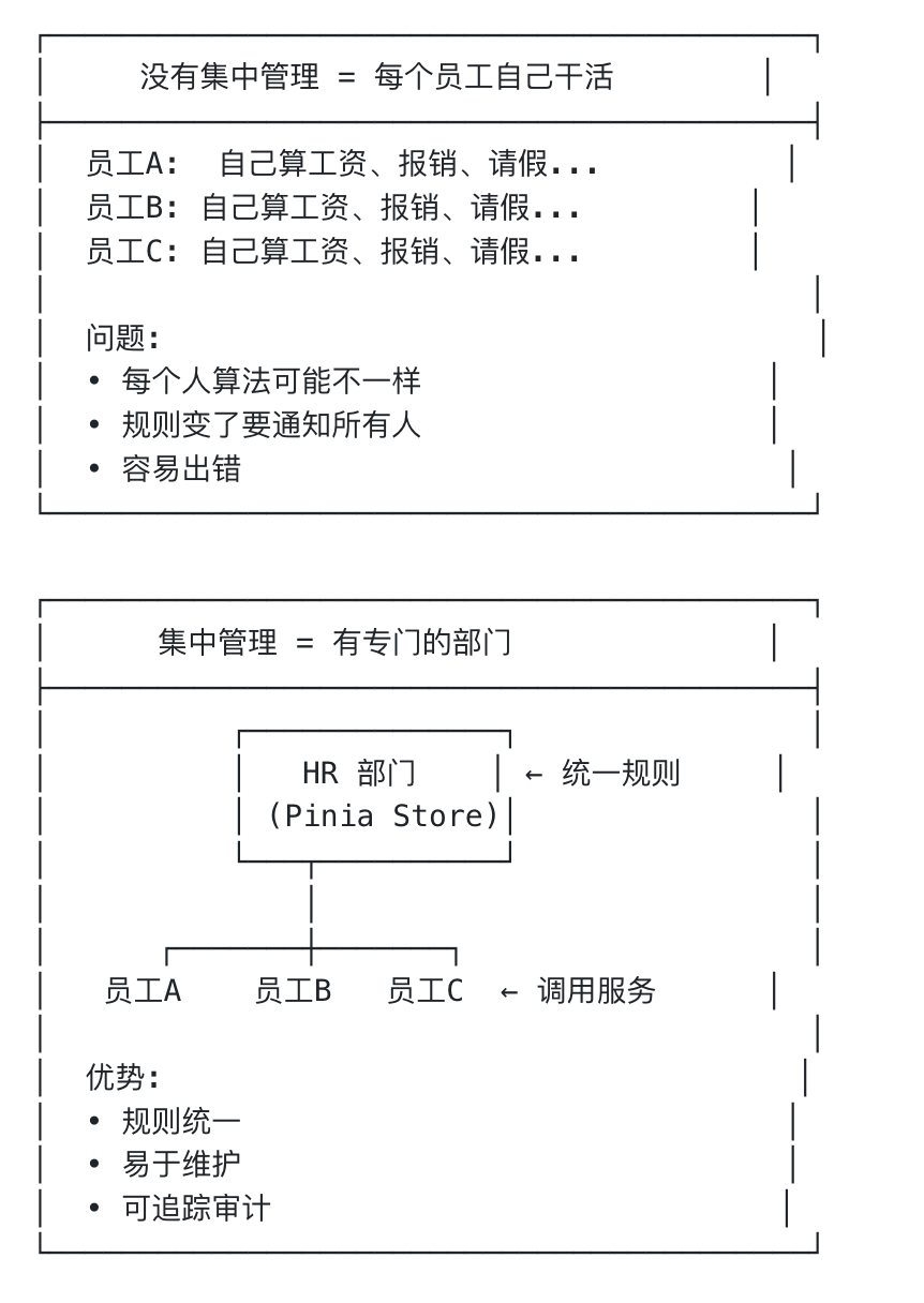 pinia 不是存储数据的吗? 为什么需要把 “复杂的业务逻辑需要集中管理” ?